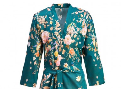 Der Christian Fischbacher Kimono "Fantasia" vereint kunstvolle Optik mit luxuriösem Tragekomfort. Auf der elegant schimmernden Satin-Außenseite entfaltet das fantasievolle Dessin seinen Zauber: ein Reigen aus Pfingstrosen, Kamelienblättern, australischen Wildblumen und schillernden, exotischen Vögeln. Handgemalte Elemente und transparent schimmernde Blüten erzeugen auf dunklem Fond eine eindrucksvolle Tiefe – ein stilvolles Statement für Ihre Me-Time zuhause und auf Reisen.