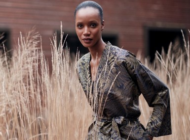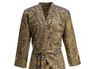 Die kimono-typische, legere Silhouette mit Bindegürtel umspielt die Figur und macht "Farn" zum stilvollen Begleiter für Zuhause, Spa oder Reisen. Das hochwertige Jacquard-Gewebe aus Baumwolle liegt glatt auf der Haut, ist angenehm zu tragen und unterstreicht den luxuriösen Charakter des Designs.